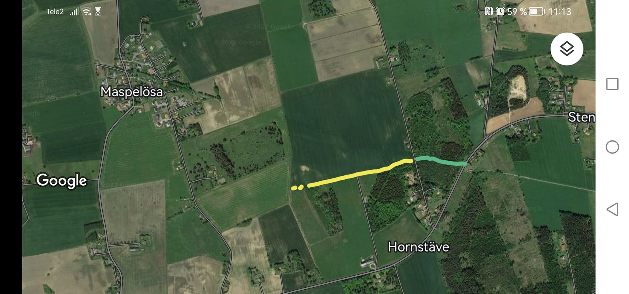 Gult streck på kartan = den sk Solrosvägen över fältet vid Hornstäve gård. Grönt streck = stigen genom Hornstäveskogen fram till Lv1050. Sen, på andra sidan om fastigheterna intill Lv1050, är det rakt fram längs den gamla järnvägsbanvallen ända bort till Gullberg.